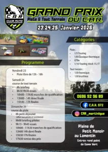 le Grand Prix du C.A.R. – Piste & Tout Terrain, se tiendra les 23, 24 et 25 janvier 2026 sur le circuit de la Plaine de Petit Manoir au Lamentin, à l’entrée du rond-point de Gamm Vert.