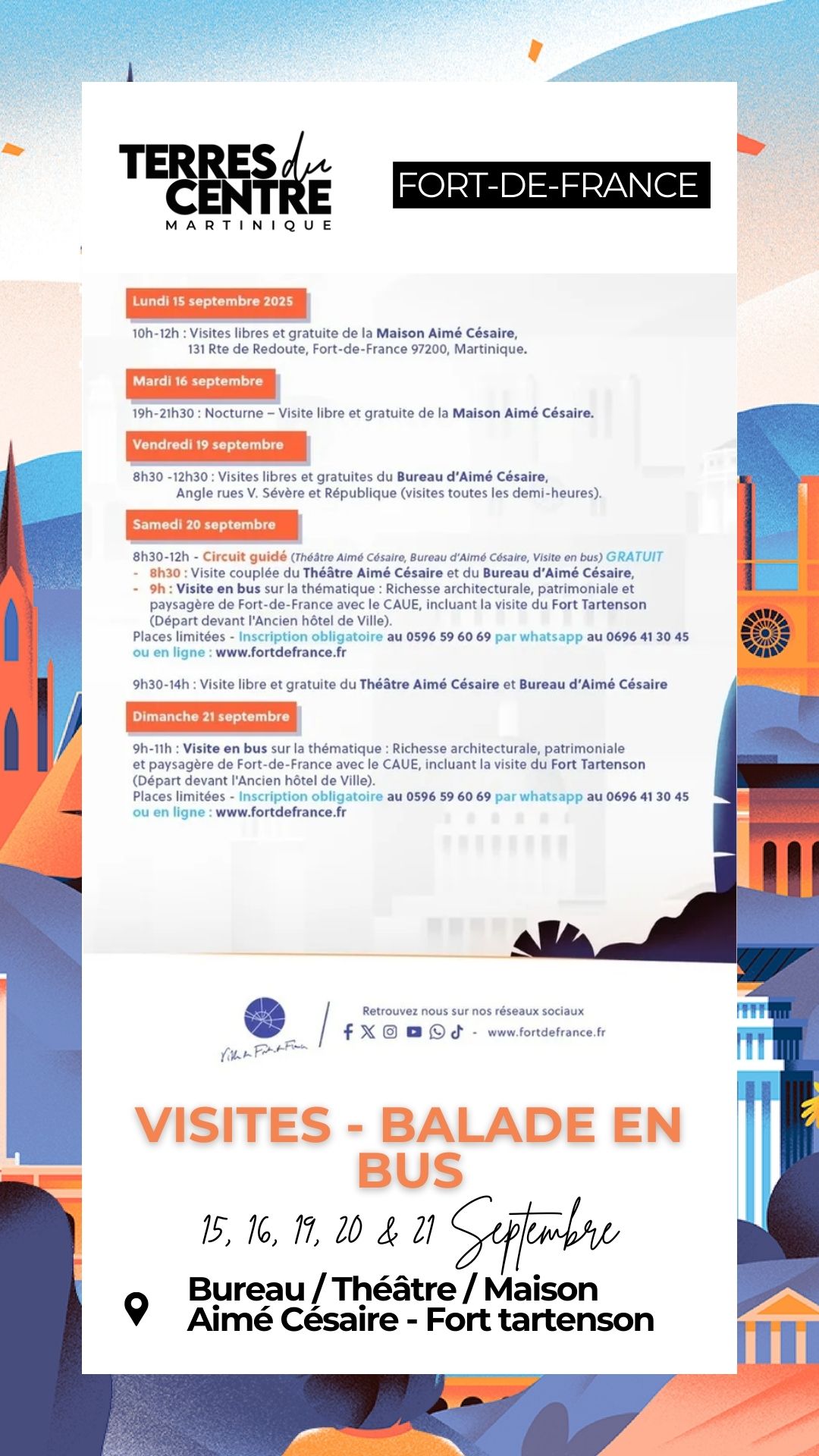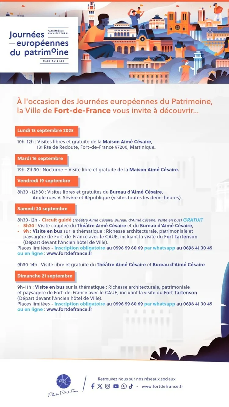 Circuit guidé « Richesse Architecturale, Patrimoniale et Paysagère de Fort-de-France » Samedi 20 septembre 2025 – 08:30 ⤏ 12:00 | Dimanche 21 septembre 2025 – 09:00 ⤏ 11:00 | Départ devant l’Ancien hôtel de Ville rue Victor Sevère, Fort-de-France Visite couplée du Théâtre Aimé Césaire et du Bureau d’Aimé Césaire et balade en bus sur la thématique avec le […]