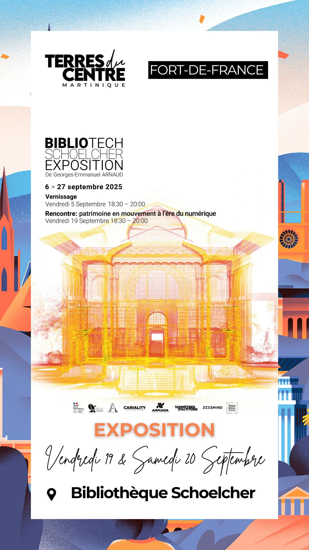 Exposition de “Bibliotech” Georges-Emmanuel Arnaud Vendredi 19 septembre 2025 – 08:30 ⤏ 17:00 | samedi 20 septembre 2025 – 08:30 ⤏ 12:00 | 1 rue de la Liberté – Fort-de-France Regard inédit sur la Bibliothèque Schœlcher : une traversée visuelle où la matière du patrimoine se transforme en nuages de points.